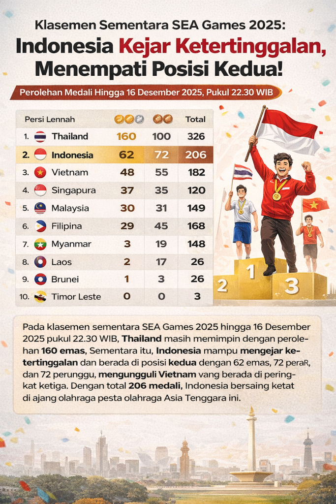 Thailand masih memimpin klasemen dengan perolehan emas yang signifikan, sementara Vietnam berada di posisi ketiga dan terus memberi tekanan. Meski demikian, tren peningkatan perolehan medali Indonesia menjadi sinyal kuat bahwa peluang untuk mempersempit jarak masih terbuka. Dukungan masyarakat dan fokus pada cabang-cabang unggulan diharapkan mampu mengantarkan Indonesia meraih hasil terbaik hingga penutupan SEA Games 2025.